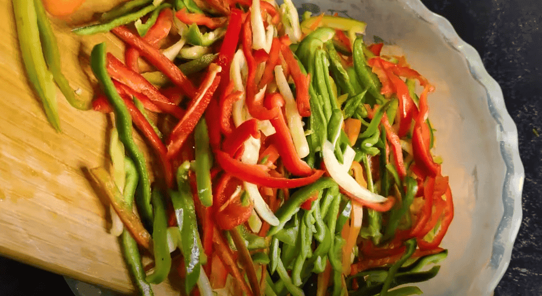 1. Перець розрізаємо на дві половинки та очищаємо від насіння та перегородок. Вага в очищеному вигляді 2 кілограми. Нарізаємо перець вузькою соломкою.