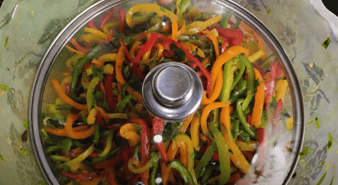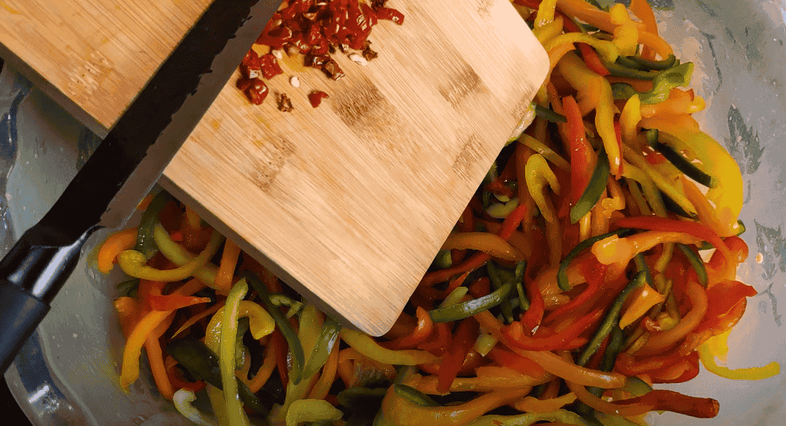 3. Перець перемішуємо ще раз. У центрі перцю робимо поглиблення та висипаємо червоний гострий перець.