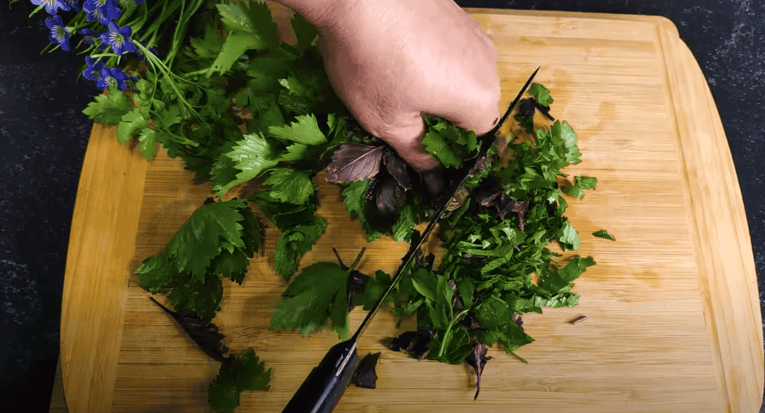 4. Беремо петрушку, базилік та селеру. Зелень подрібнюємо.