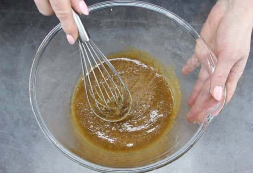 - У миску розбиваємо 1 яйце, додаємо 100 г цукру, 80 мл олії, 80 г рідкого меду, 1 ч.л. соди (без гірки) та за бажанням 1 ч.л. меленої кориці. Перемішуємо вінчиком до однорідності.