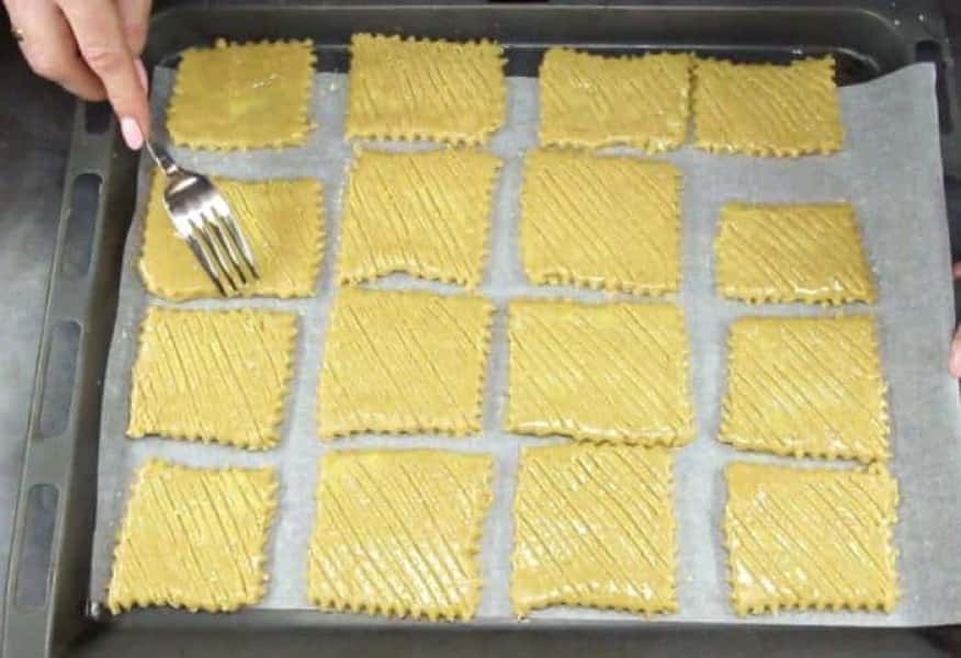 - Перекладаємо заготовки на лист, застелений папером для випічки. Змащуємо зверху жовтком та за допомогою вилки робимо візерунок.