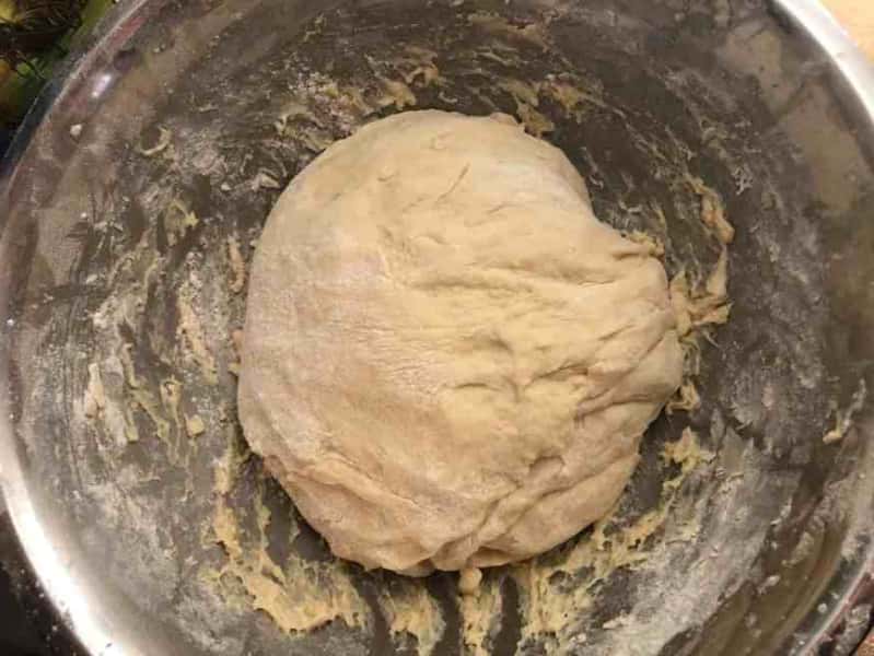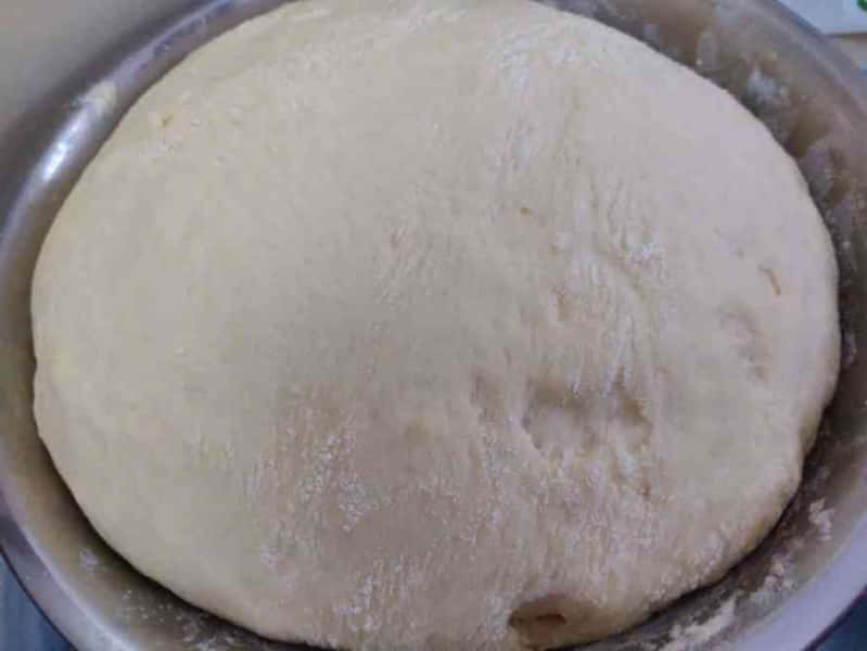 6. Коли тісто замісили присипаємо його трішки борошном, щоб не липнуло до рук, викладаємо на дошку та розтягуємо руками.