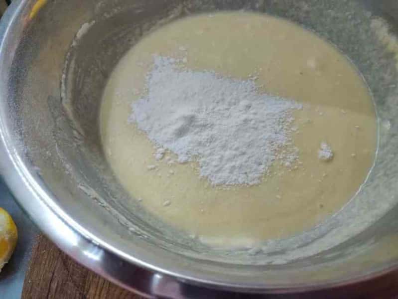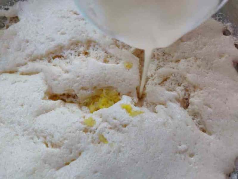 5. Коли опара підійшла, тремо туди цедру, виливаємо розтоплене масло, збиті яйця і кефір з сметаною.