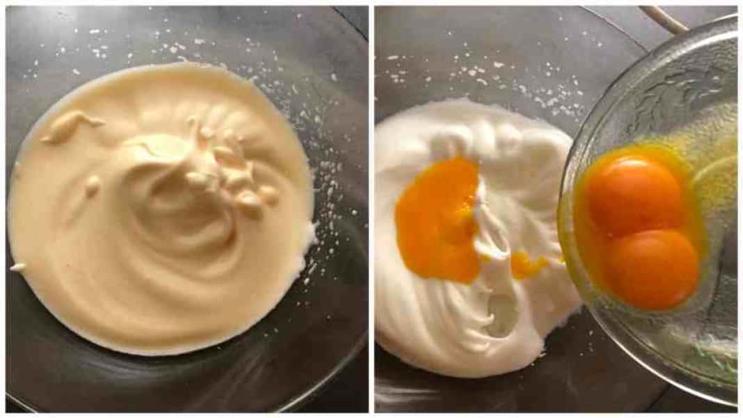 3. Яєчні білки відділяємо від жовтків, збиваємо міксером у круту піну, додаємо жовтки і ще раз збиваємо.