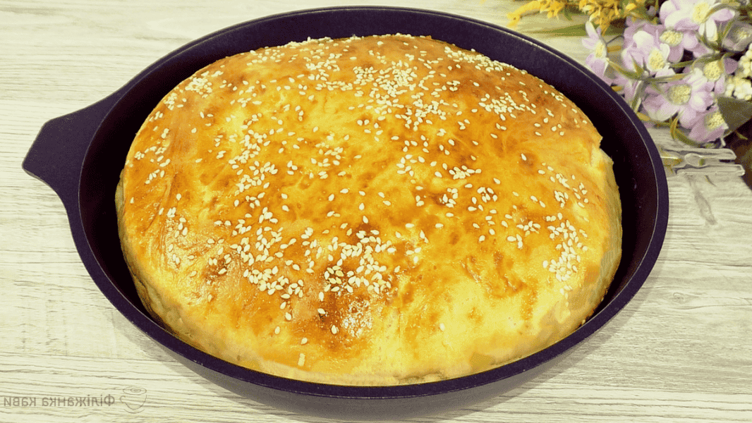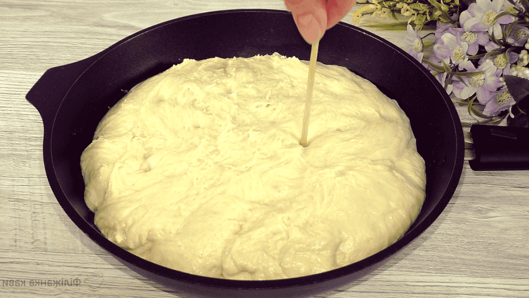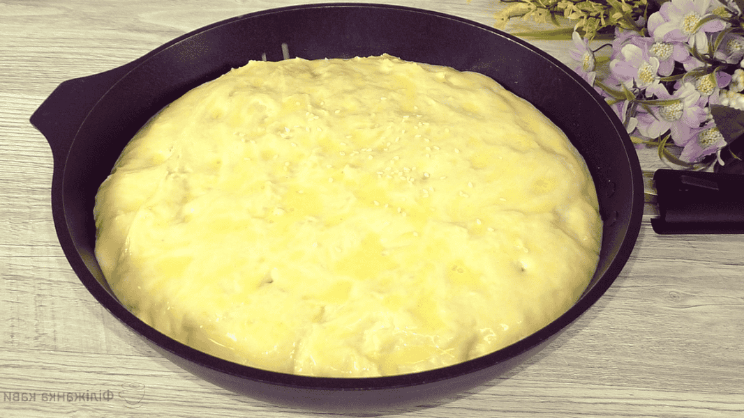 Тісто підійшло, змочую руки олією і відправляю тісто в змащену олією сковороду, випікати буду в ній ( ручка у сковороди знімна ) роблю кілька отворів дерев’яною паличкою і даю тісту підійти поки нагрівається духовка до 180 градусів.