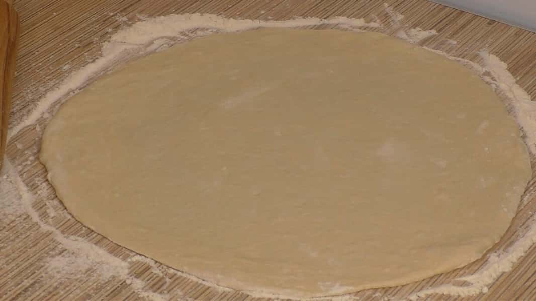 Розгортаємо тісто від середини до країв. Якщо ви хотіли тісто розділити на дві частини, то піца вийде у нас досить велика близько 30 сантиметрів діаметром.