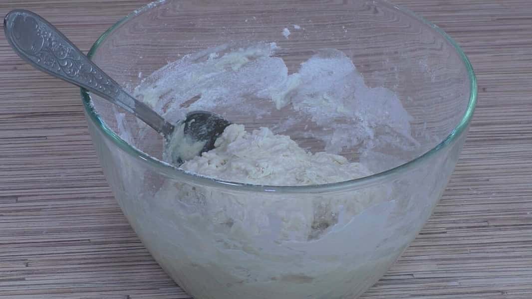 Далі сюди додаємо оливкову або соняшникову олію. Починаємо потроху просівати борошно та замішуємо тісто. Як тільки все борошно додали – починаємо вимішувати тісто.