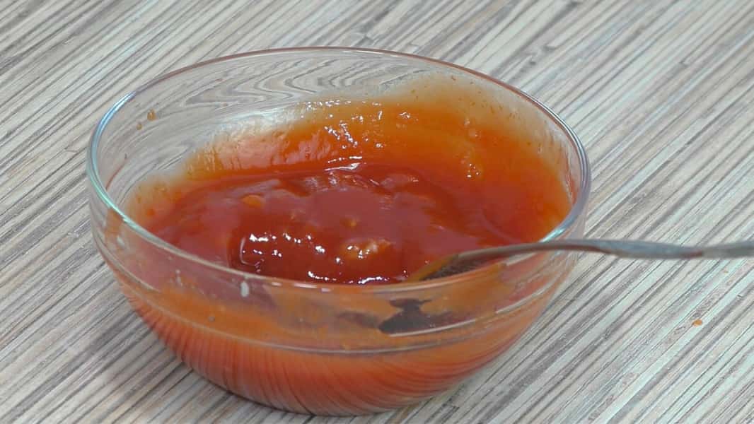 Займемося соусом для піци. До кетчупу додаємо пропущені через прес 2 або 3 зубчики часнику. І все ретельно перемішуємо. Наш соус готовий. Соус знадобиться десь 2-2,5 ложки на одну піцу.