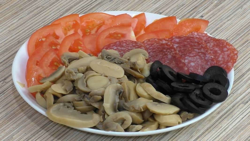 Помідори ріжемо півкільцями, оливки кільцями, печериці я вже купила різані, як і Салямі. Найголовніше, щоб усі інгредієнти були нарізані тонко.