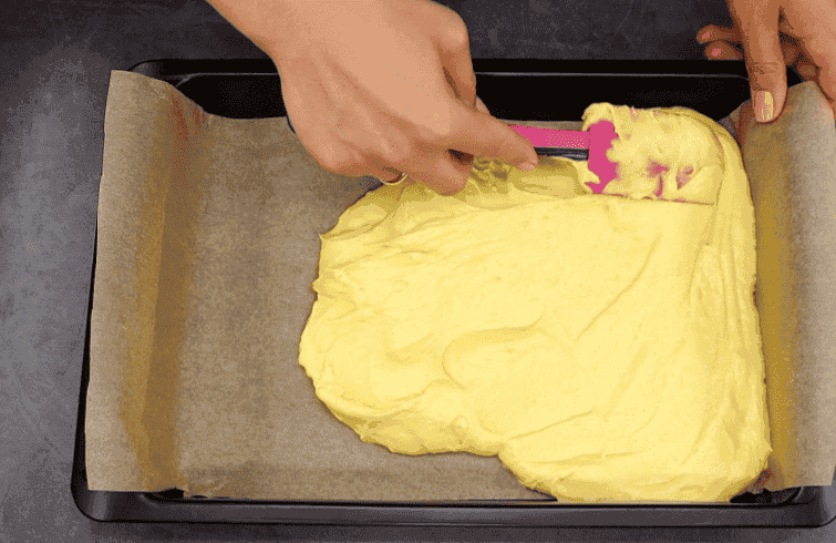 На дно форми для випікання обов’язково кладемо лист пергаментного паперу, це робиться для того, щоб пиріг ми змогли дістати з форми. Розмір моєї форми 23х33 см. Перекладаємо в неї тісто та рівномірно розрівнюємо його по всій поверхні.