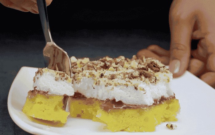 Поступово розподіляємо їх по всьому бісквіту і ще раз ставимо пиріг в духовку на 10-15 хвилин, поки безе не стане золотаво-коричневим кольором. Температуру в духовці залишаємо такою самою – 180 градусів.