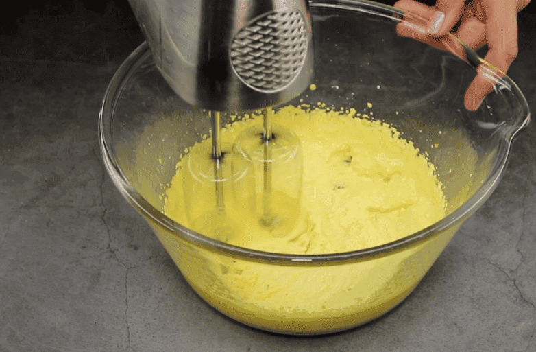 Для початку яйця поділяємо на жовтки та білки. Білки на якийсь час ставимо в холодильник, а жовтки переливаємо в миску, додаємо щіпку солі, всипаємо 125 г цукру (це половина від загальної зазначеної кількості) і за допомогою міксера збиваємо жовтки до пишної маси, близько 2-х хвилин.