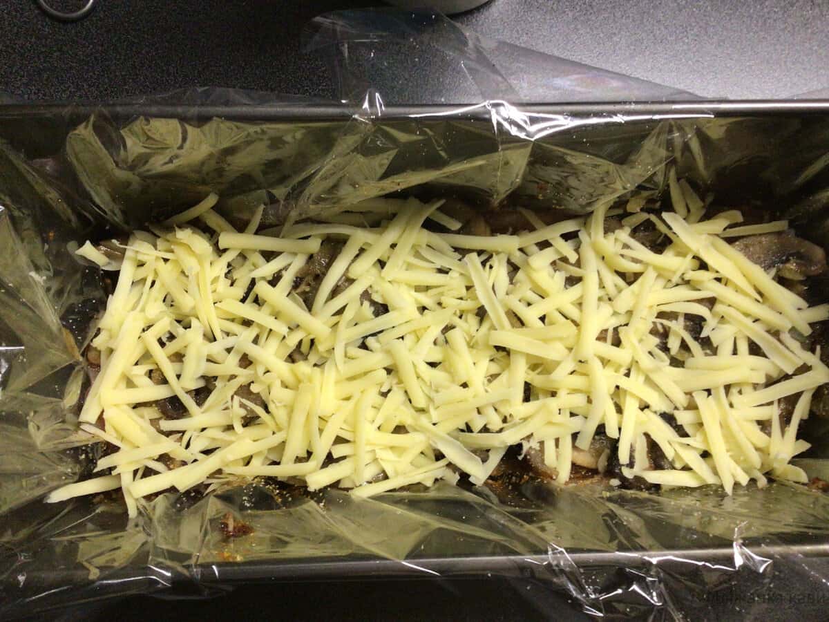 Далі знову гриби, сир. У мене вийшло чотири шари м’яса, між ними сир і гриби. Кожен шар м’яса треба посипати желатином. Завершальний шар, це м’ясо.