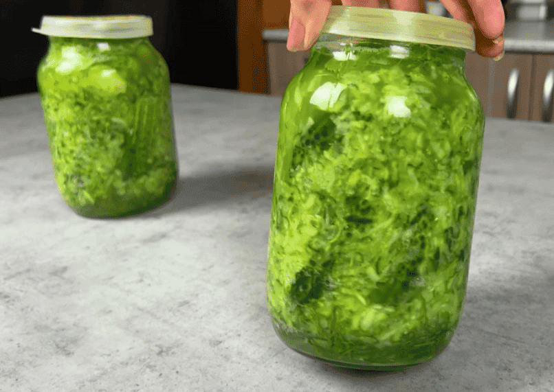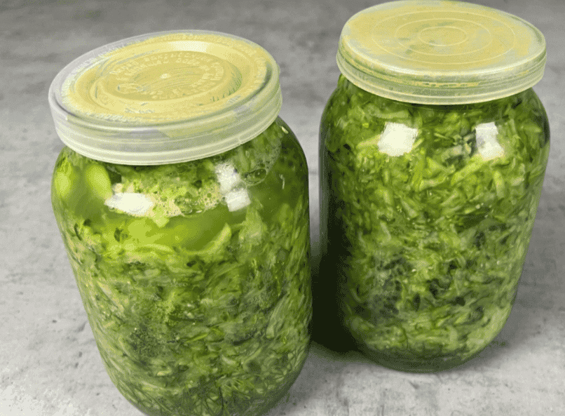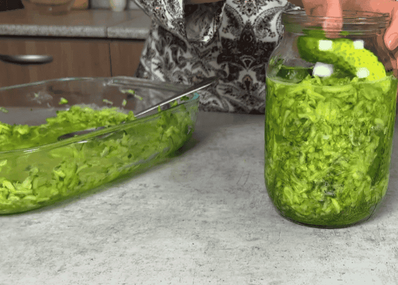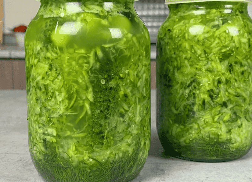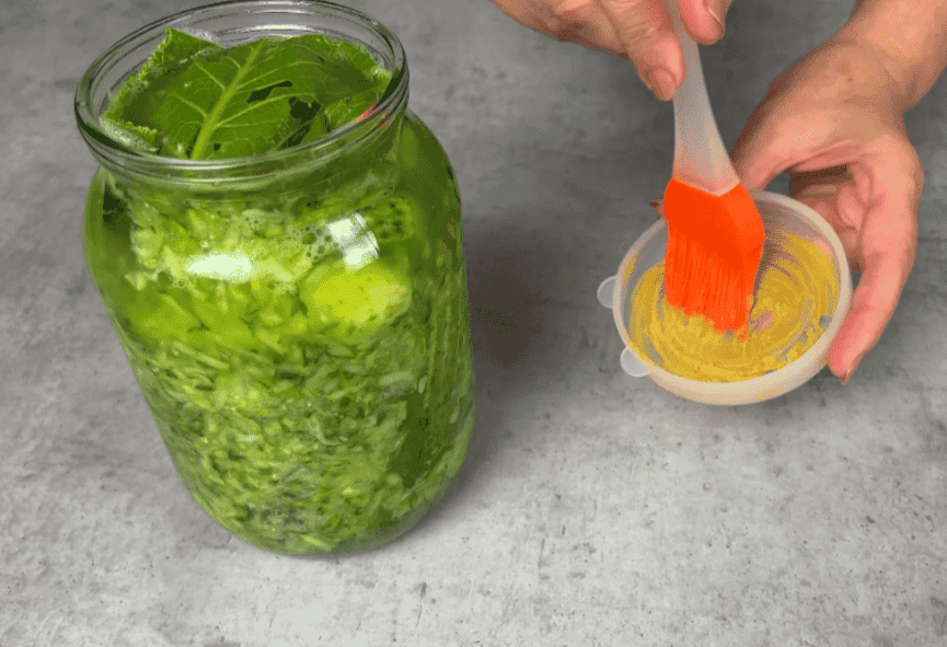 Мені 1 кг натертих огірків вистачає на 2 літрові банки. Зверху кладемо лист хрону. Кришку змащуємо гірчицею, щоб огірки не покривалися пліснявою.