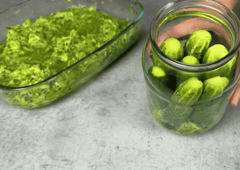 На дно чистої банки кладемо кріп, банки заздалегідь стерилізую. Кладемо натерті огірки із часником. Заповнюємо банку щільно огірками. Перекладаємо натертими огірками.
