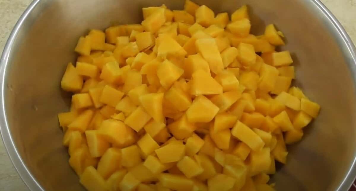 Гарбуз ( у мене сорт Хоккайдо ) очищаємо від шкірки і нарізаємо на невеликі кубики. Поміщаємо гарбуз в глибоку ємність, в якій в подальшому і будемо варити джем.