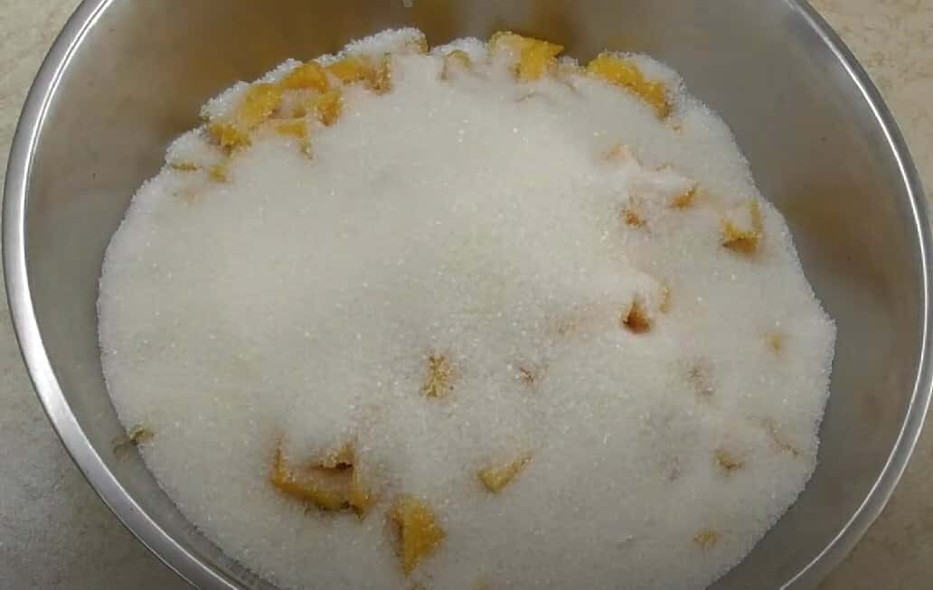 Засипаємо гарбуз цукром. Його кількість ви можете регулювати під себе. Ми залишаємо гарбуз на 30 хвилин, щоб виділився сік.