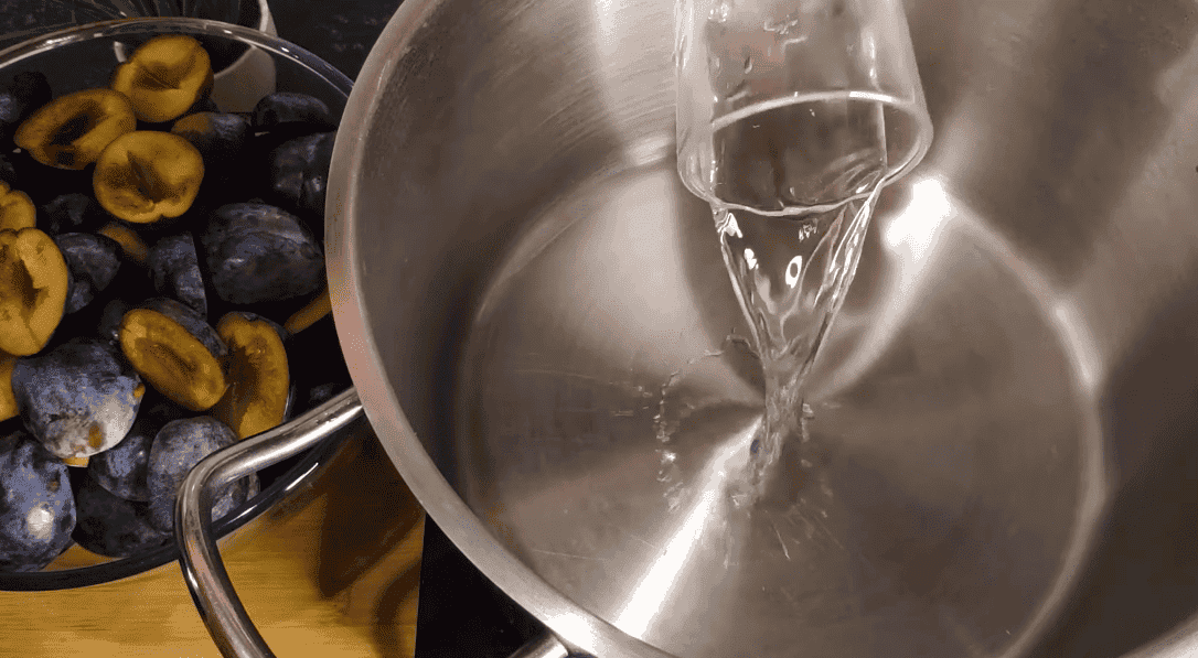2. На плиту ставимо каструлю з товстим дном, наливаємо воду 100 мл, щоб не прилипла слива, поки не пустить сік. Перекладаємо сливу в каструлю.