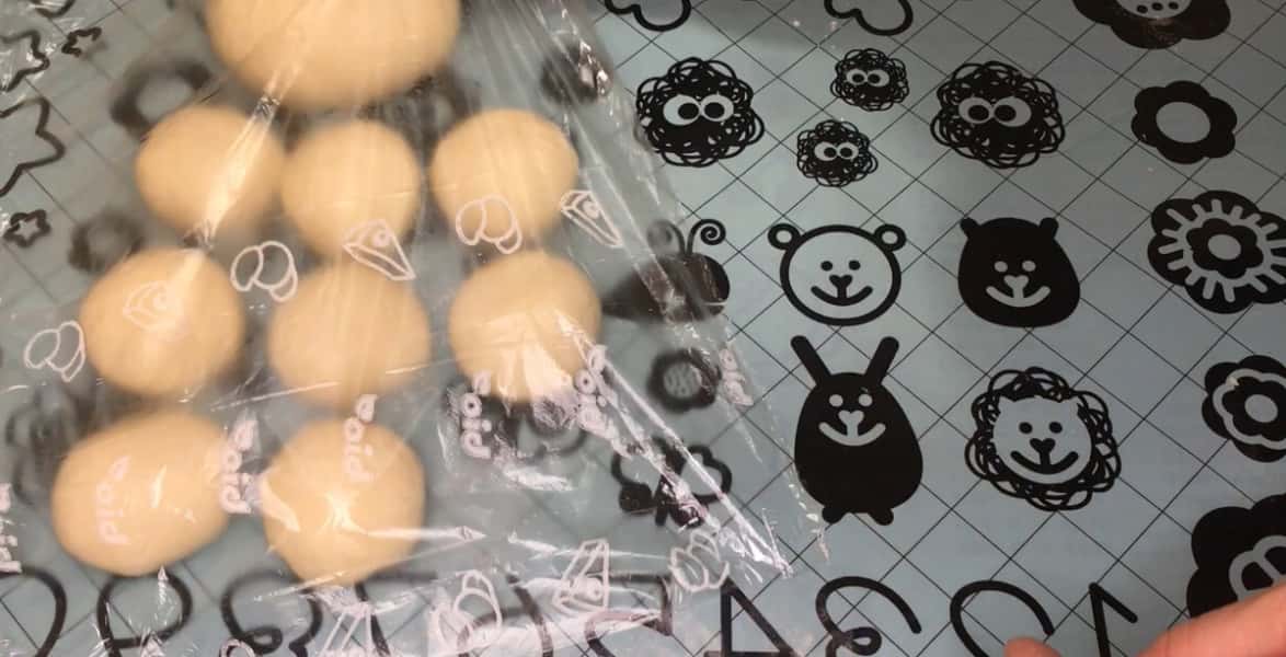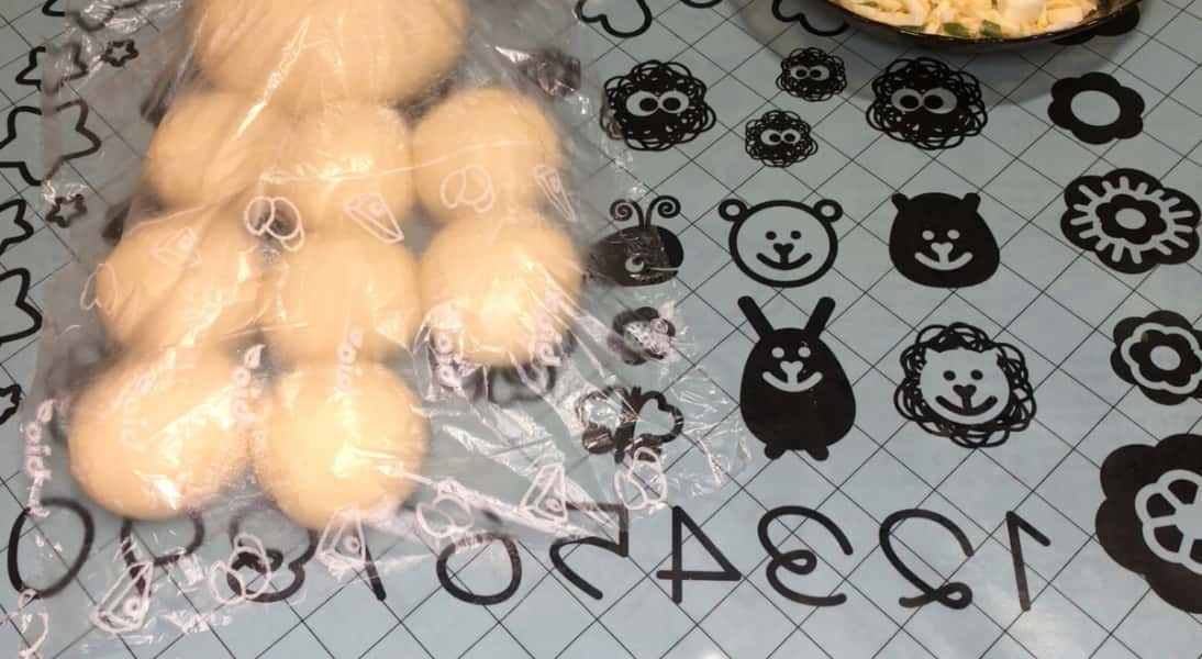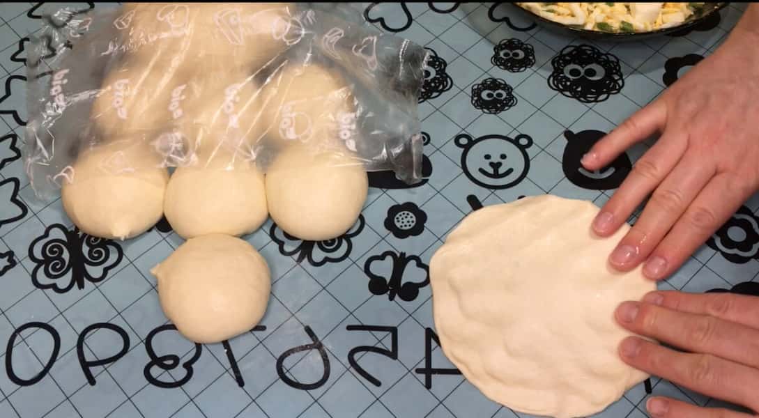 Тісто я поділила на дві рівні частини. Одну частину тіста залишила для піци, а другу частину – поділила на вісім маленьких кульок. Кожну кульку підкачуємо, потім накриваємо плівкою і даємо відпочити заготовкам 5 хвилин.