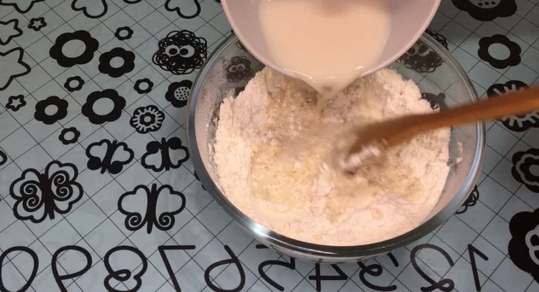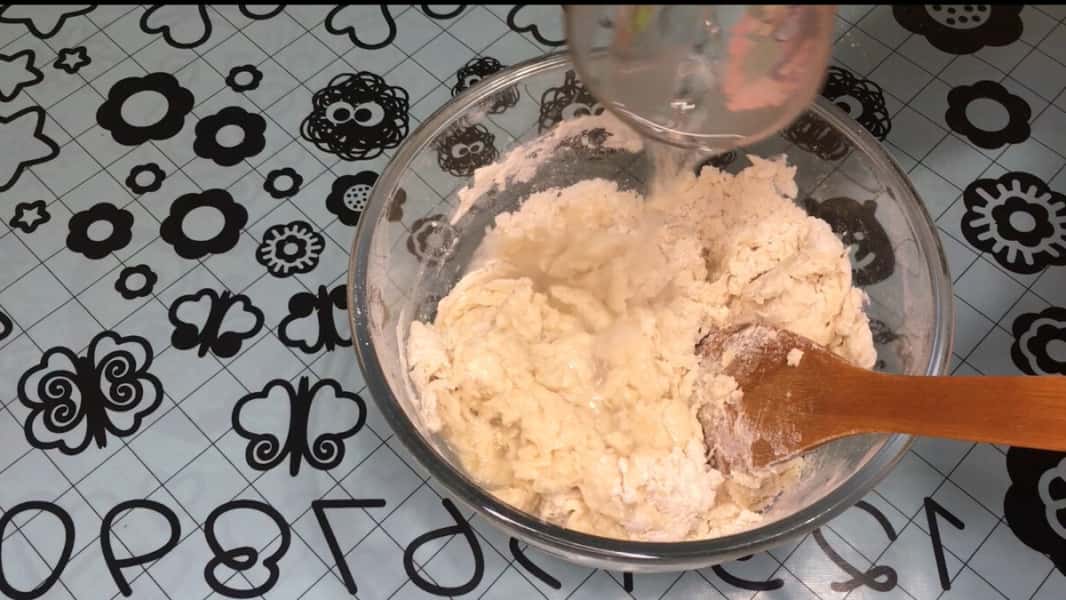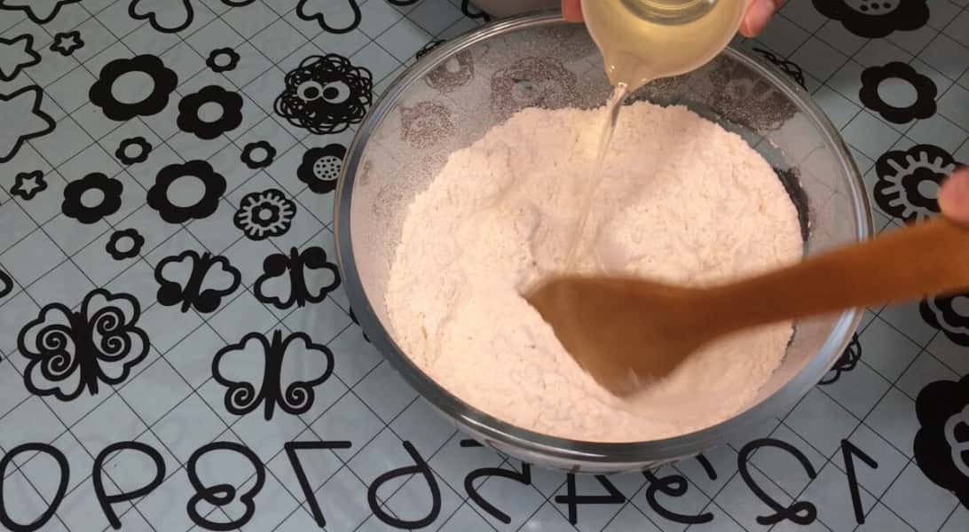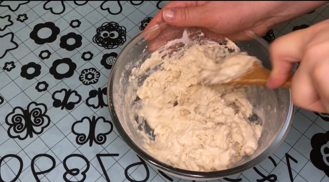 Борошно увібрало всю рідину, вливаємо 150 мл окропу крутого і продовжуємо замішувати тісто.