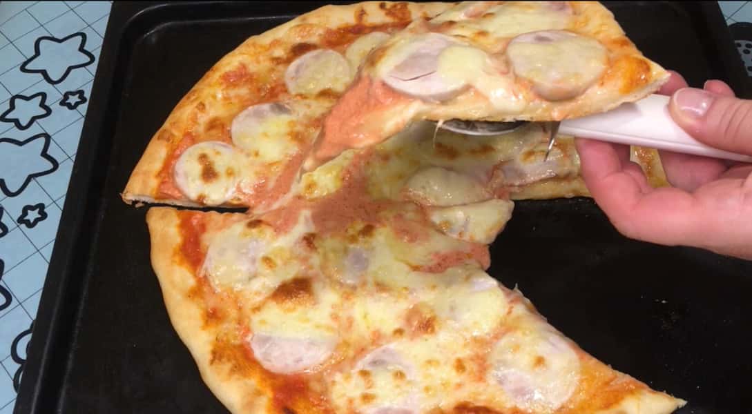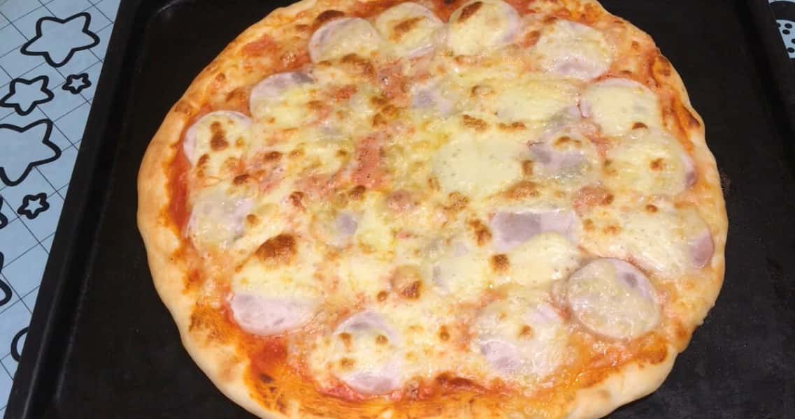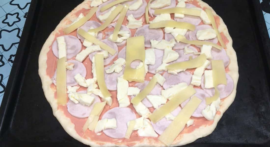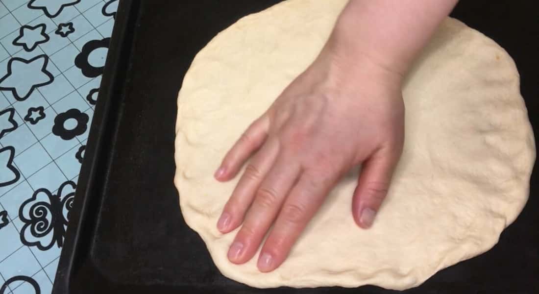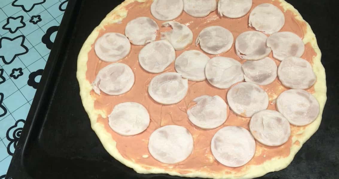 З іншої частини тіста я приготувала піцу. Тісто укладаємо на лист і розтягуємо в коло, залишаючи по краях бортики.