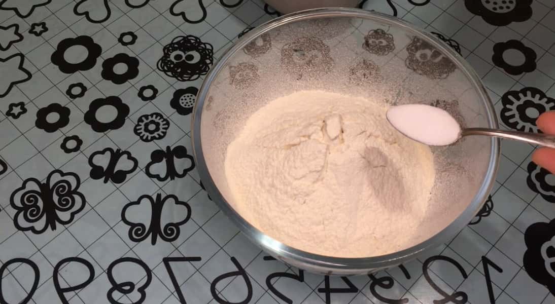 У миску просіюємо 450 г борошна, додаємо 1 ч л під ніж солі, вливаємо 60 мл олії, розмішуємо, робимо поглиблення та вливаємо дріжджову суміш, замішуємо тісто.