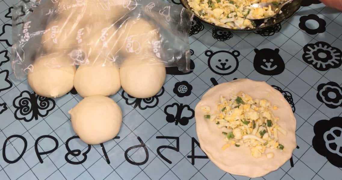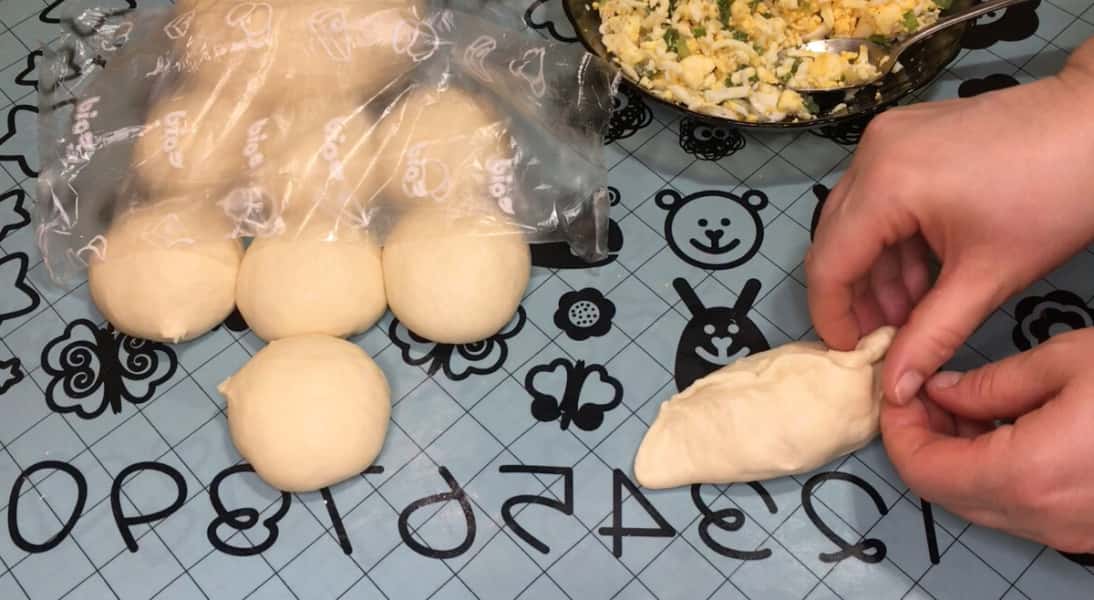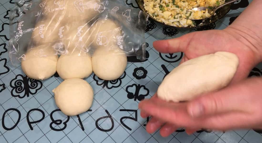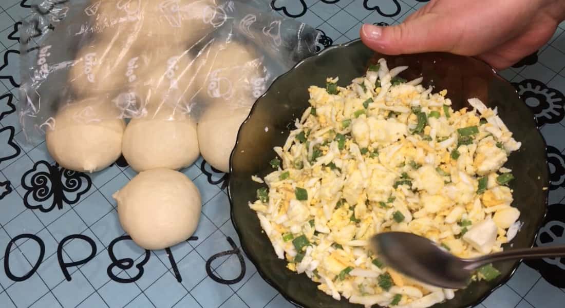За цей час тісто трохи піднялося. Стіл злегка змащуємо олією, кладемо кульку тіста і руками розтягуємо в коржик. На середину кожного коржика кладемо начинку, у мене сьогодні пиріжки з яйцем , сиром і зеленою цибулею, все посолила і поперчила до смаку і начинка готова. Формуємо пиріжки, і даємо постояти 5хвилин.
