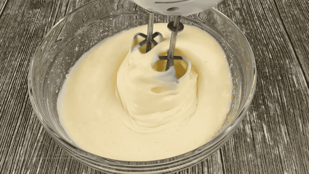 Яйця з цукром збиваємо міксером до побіління та збільшення в об’ємі ~ в 3 рази. На процес збивання піде ~5 хвилин на середній швидкості.