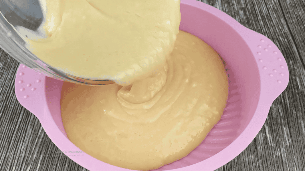 Тісто переливаємо у силіконову форму d – 21 см. Можна використовувати роз’ємну, але потрібно зі зворотного боку дно та боки обернути фольгою, щоб не витекло тісто. Форму змащуємо олією без запаху.