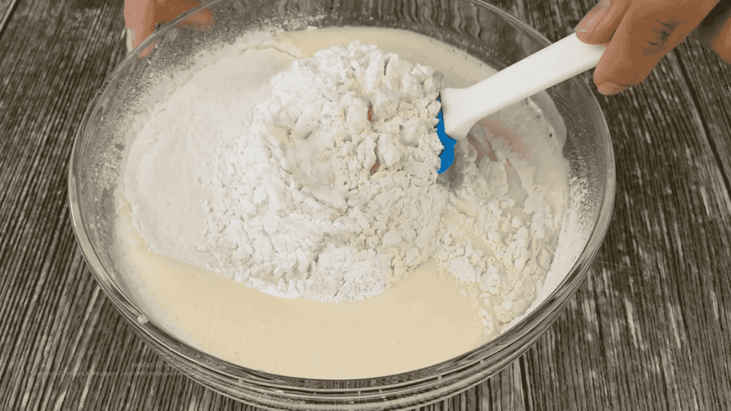Останніми через сито просіюємо 12 ст. л борошна та 1 п (10 г) розпушувача. Щоразу використовуємо ту саму ложку. Лопаткою вимішуємо тісто. Воно середнє за консистенцією.