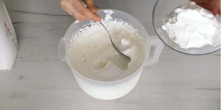 5. У три етапи додати білки, кожен раз добре вимішуючи ложкою.