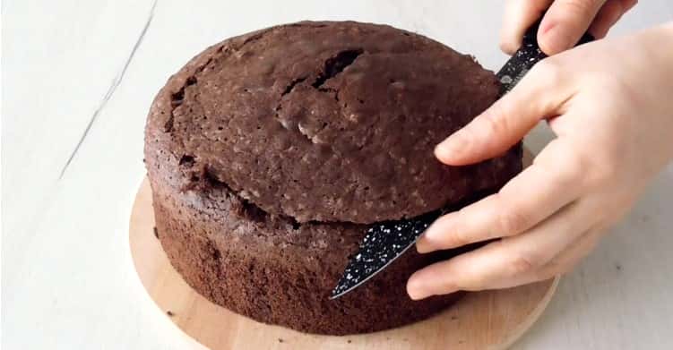 9. Бісквіт розрізати на три коржі будь-яким зручним для вас методом. Я це роблю ниткою або ножем.