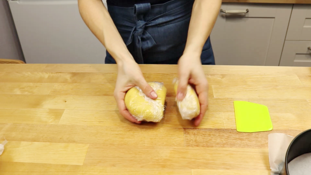 Коли основа охолоне, формую бортики. Беру меншу частину тіста, і розминаю, щоб воно стало більш пластичним. Ділю на дві частини, катаю джгути та викладаю на основу.