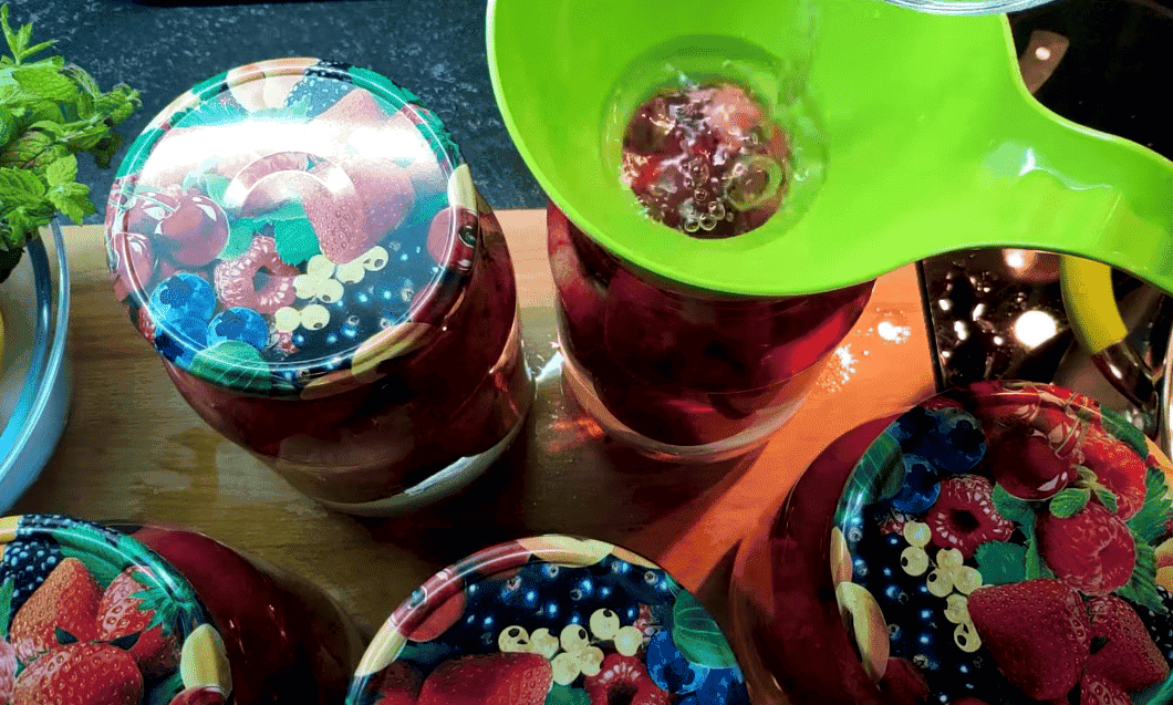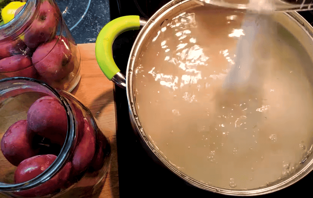 7. Киплячий сироп наливаємо в банки під зав’язку. Якщо сиропу не вистачає, його можна доповнити крутим окропом відразу в банки.