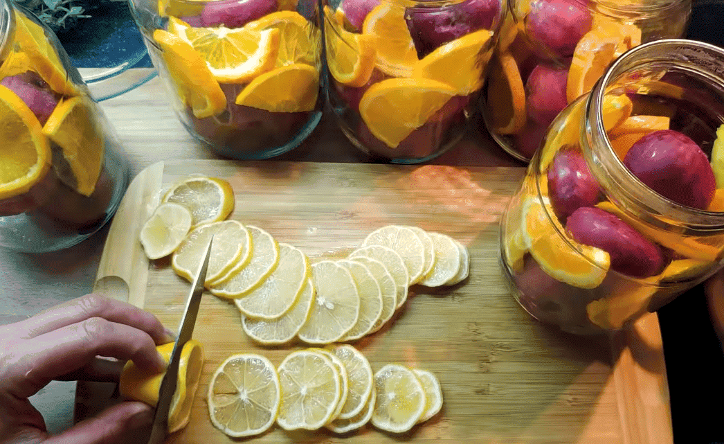 6. У лимона відрізаємо хвостики та нарізаємо тонкими кружальцями. Кладемо в кожну банку по кілька кружків лимона і пару гілочок м’яти.