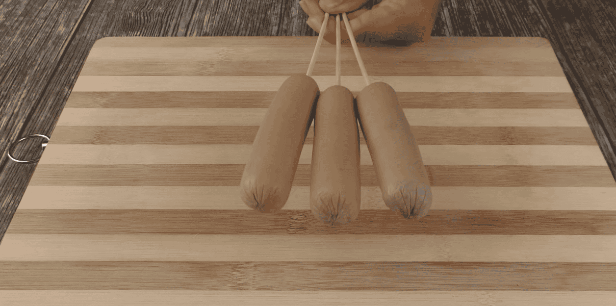 Для рецепту нам знадобляться сосиски, сир та довгі шпажки.