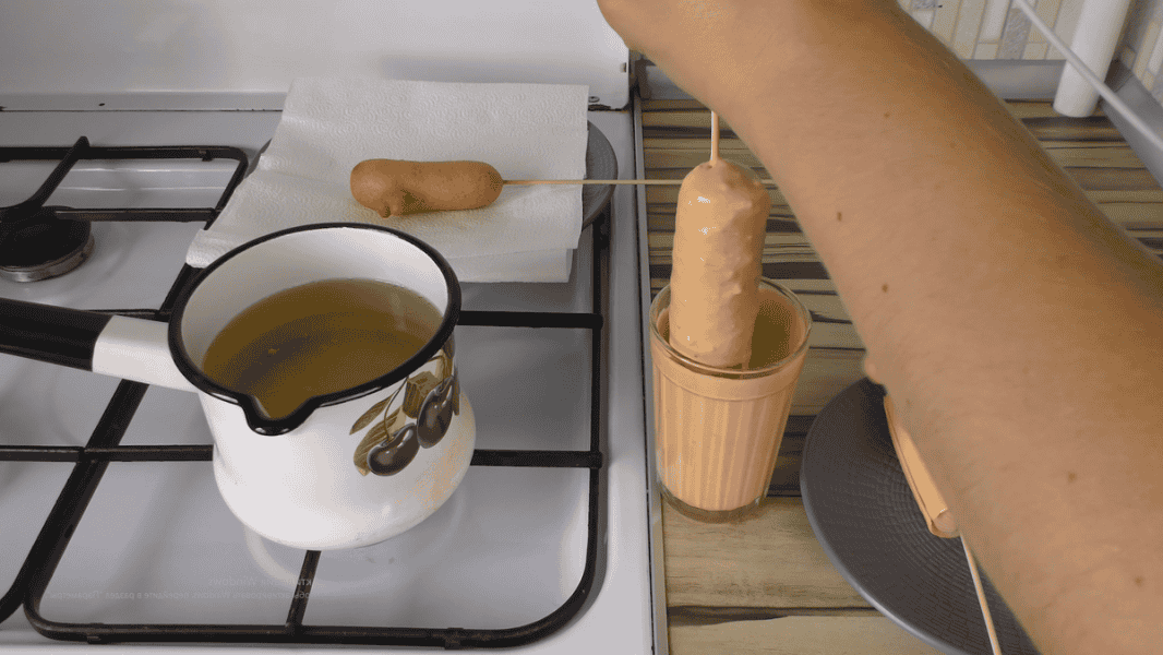 Далі дістаємо сосиску із сиром із морозилки. Занурюємо її в кляр. Прокручуємо, щоб кляр повністю покрив сосиску. Потім сосиску дістаємо зі склянки, піднімаємо та прокручуємо, щоб зайвий кляр стік і був акуратний кінчик.