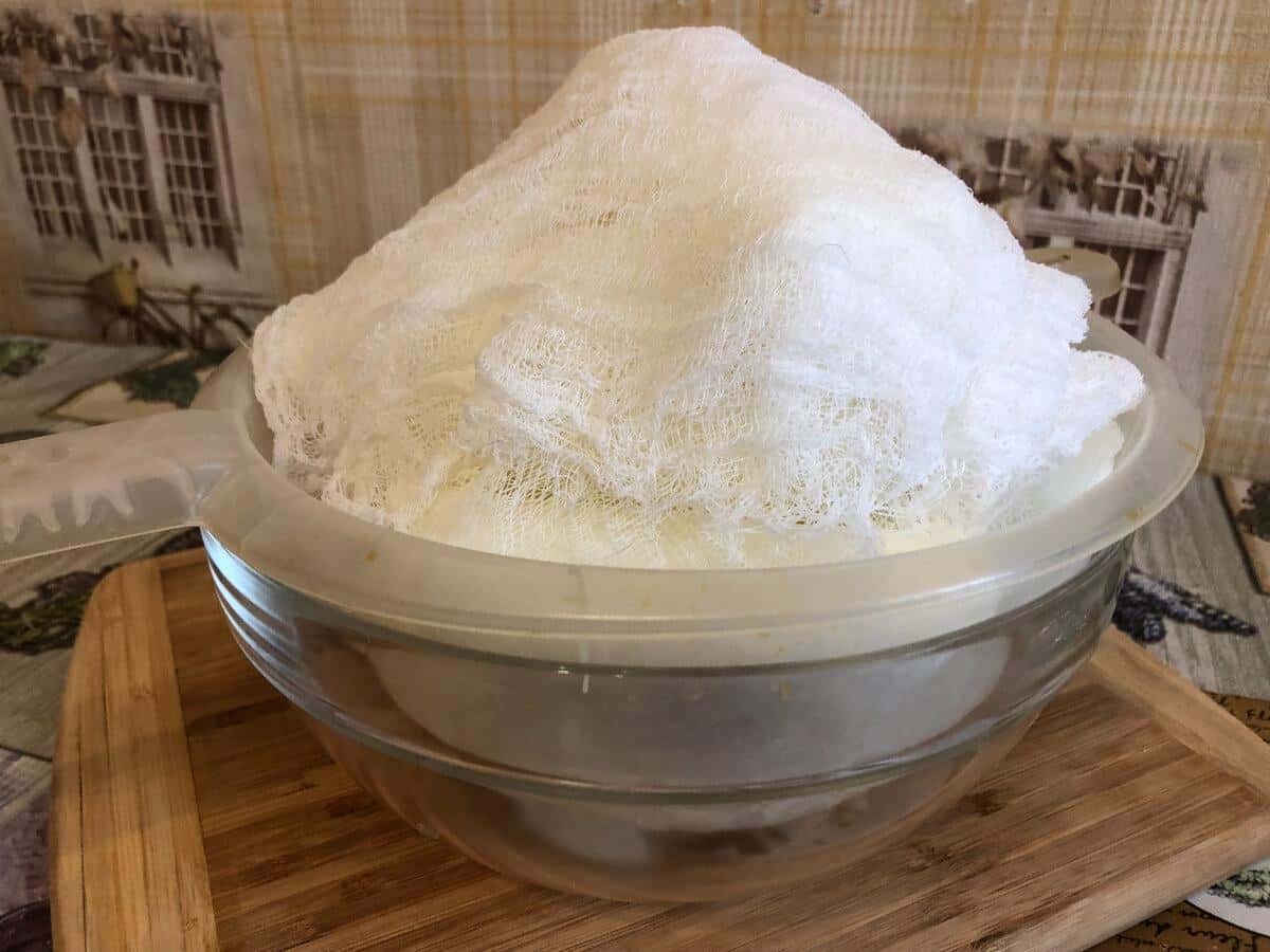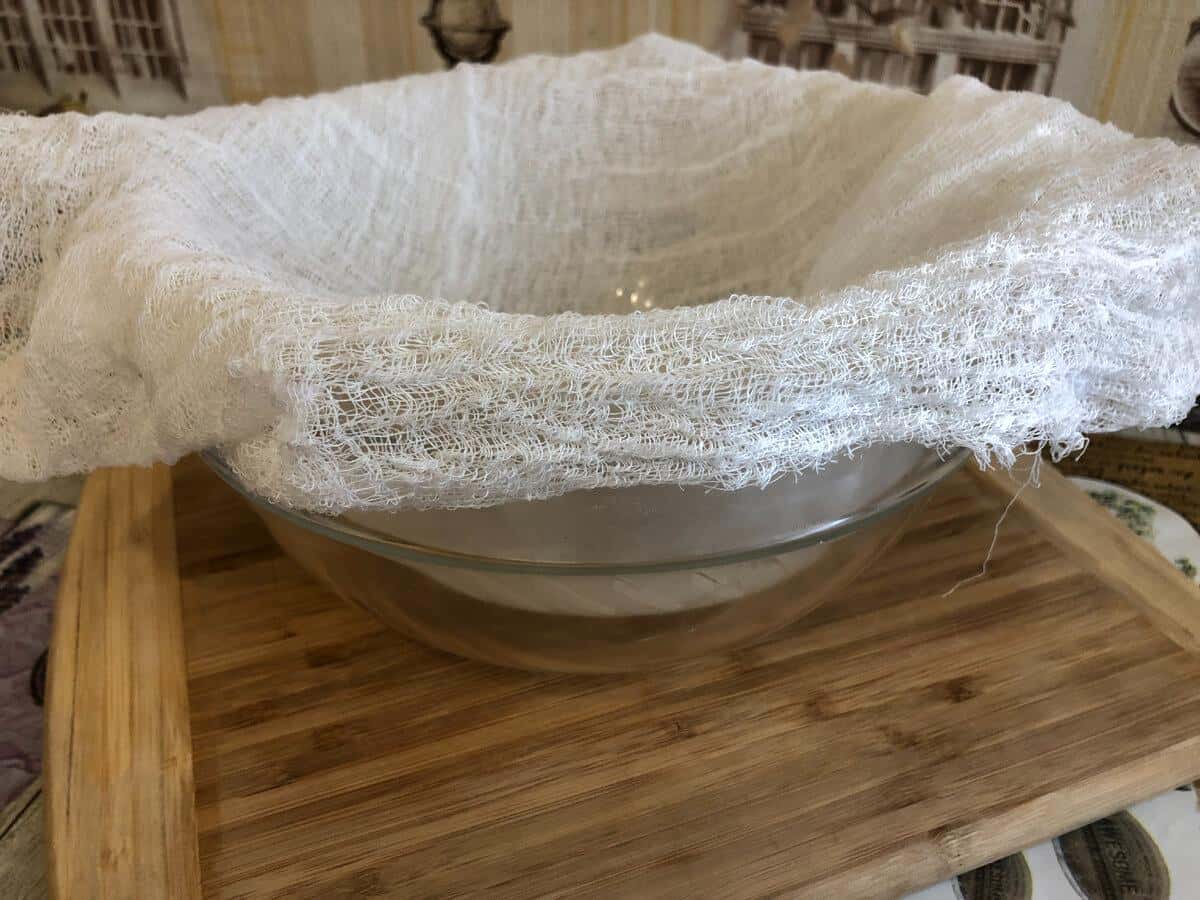 Тепер споруджуємо конструкцію: сито (або друшлак) встановлюємо на глибоку миску (або каструлю). Друшлаг застеляємо марлею.