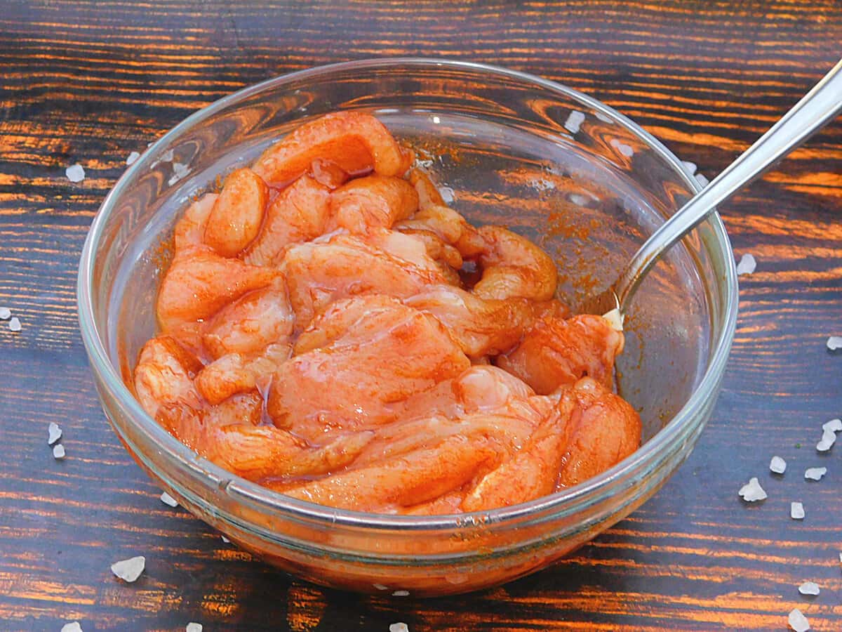 3. Викласти смужки курячого філе. Змішати і прибрати в холодильник на час не менше 12 годин. Пару раз бажано перемішати, щоб маринування відбувалося рівномірно. На дні миски практично не залишиться рідини, вся вона вбереться в курку.