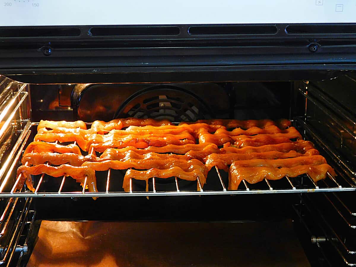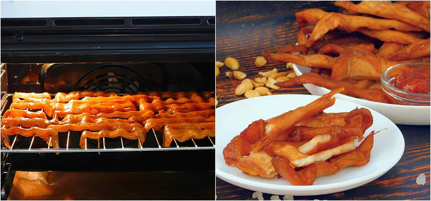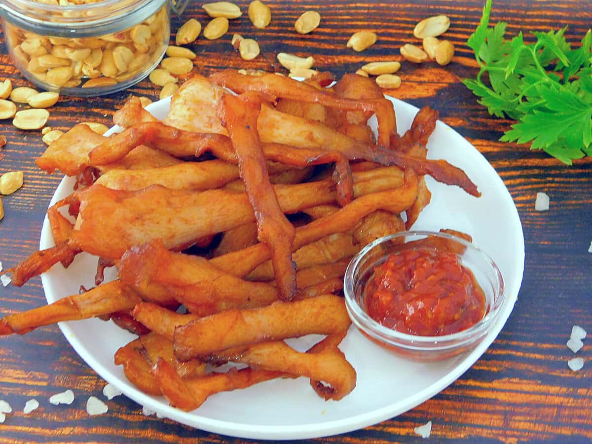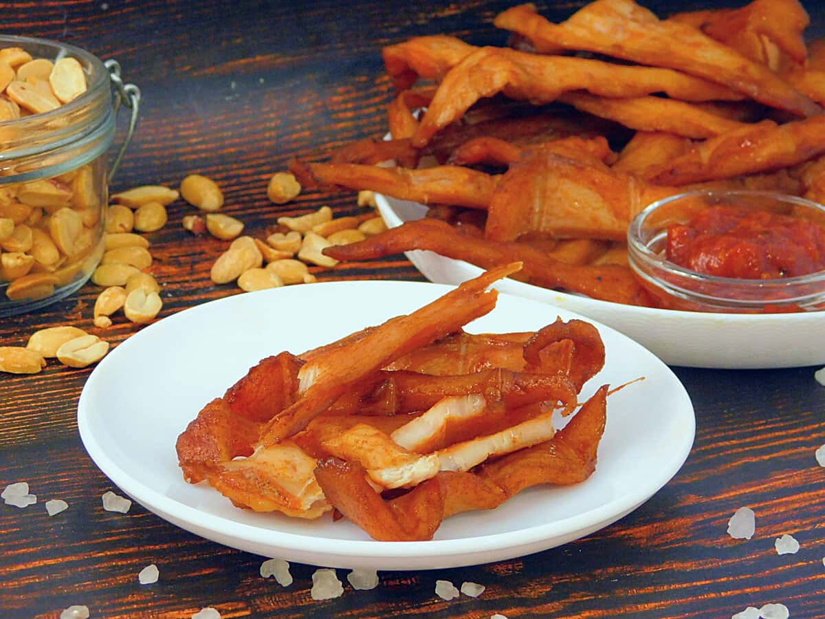 5. В’ялити в духовці при температурі 120 градусів 3-4 години. Дверцята трохи відкрити, вставивши сірник, щоб виходив пар. М’ясні шматочки повинні залишитися м’якими, тому обов’язково стежити за тим, щоб курка не пересохла. Курячі чіпси готові. Подають їх в холодному вигляді.