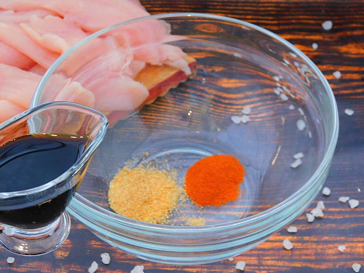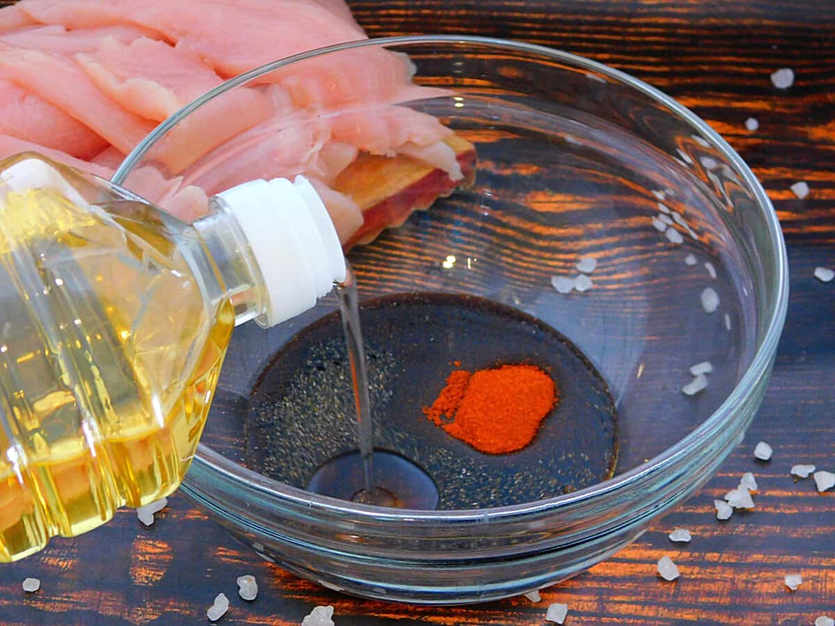 2. Куряче філе нарізати на довгі тонкі пластини. У миску всипати копчену мелену паприку і сухий часник. За бажанням для гостроти можна додати червоний пекучий перець. Влити соєвий соус і олію. Який маринад найбільше підходить до курки? Пишіть свої думки в коментарях!