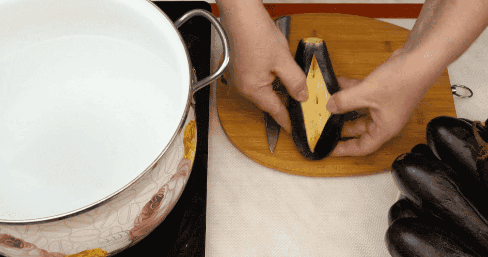 Через 5 хвилин виймаємо баклажани з каструлі і викладаємо їх на друшляк або сито, розташовуючи так, щоб розріз був збоку.