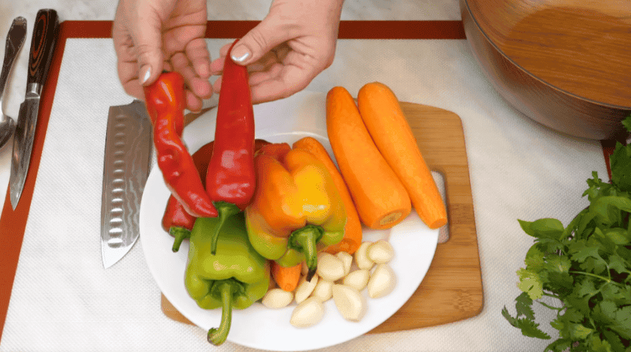 Тим часом займемося овочевою начинкою – для неї нам знадобиться 1-2 болгарські перці, 3-4 великі моркви, 2 головки часнику і гострий перець до смаку, у мене напівгострий, тому я беру 3 штуки. Мало того, беремо більше зелені – петрушку, кінзу, селеру і базилік – зелень беріть на свій розсуд.
