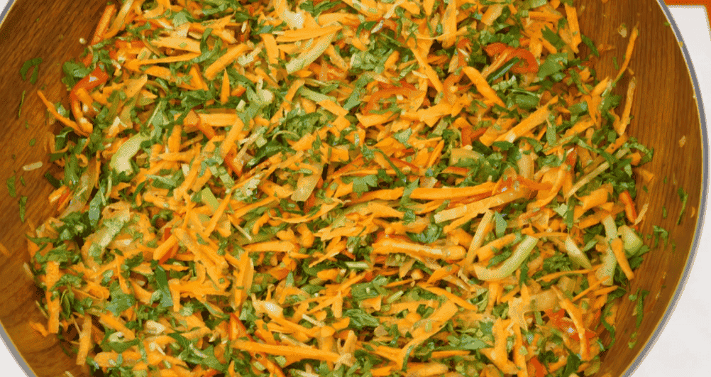 У чашу, в якій змішуватимемо начинку, натираємо моркву на великій тертці, за бажанням можна додати будь-які білі коріння – петрушку, пастернак або кореневу селера.