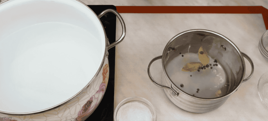 Для початку приготуємо розсіл – в каструлю наливаємо літр води, додаємо пару лаврових листочків та перець горошком, у мене чорний і запашний, всипаємо 70 г солі, все добре перемішуємо і відправляємо на плиту, кип’ятимо 2-3 хвилини, знімаємо з вогню та даємо розсолу повністю охолонути.
