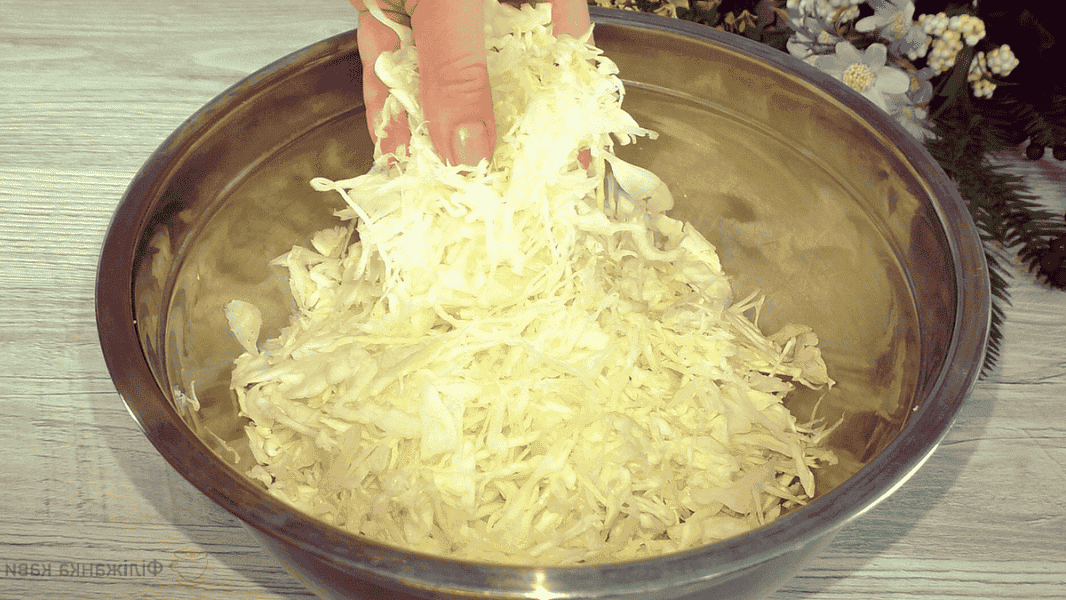 Для рецепту треба нашаткувати капусту. Капусти потрібно орієнтовно 350 грам. У капусту додати дрібку солі і добре пом’яти.