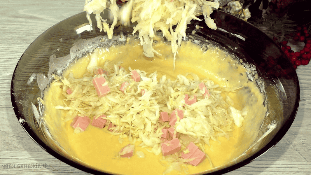 Додаю в тісто капусту з ковбасою, перемішую.