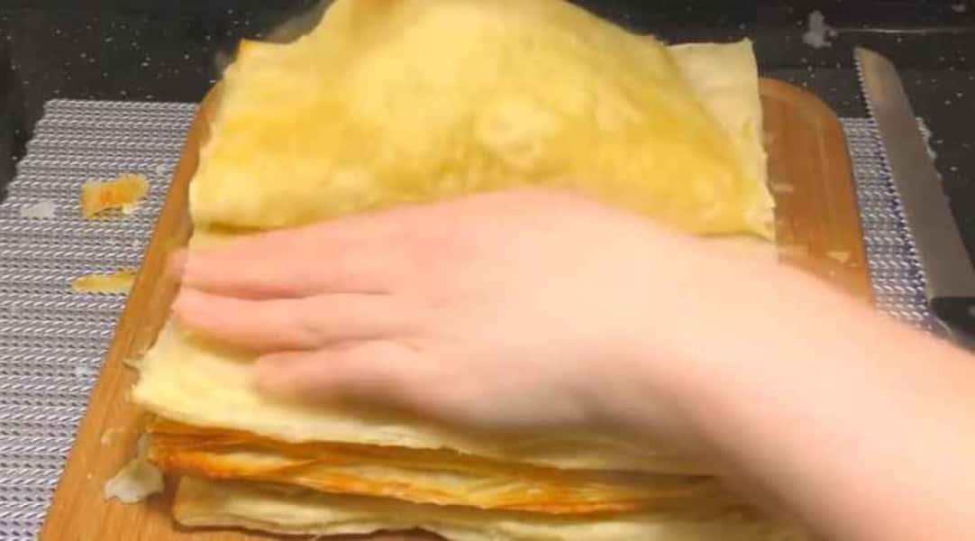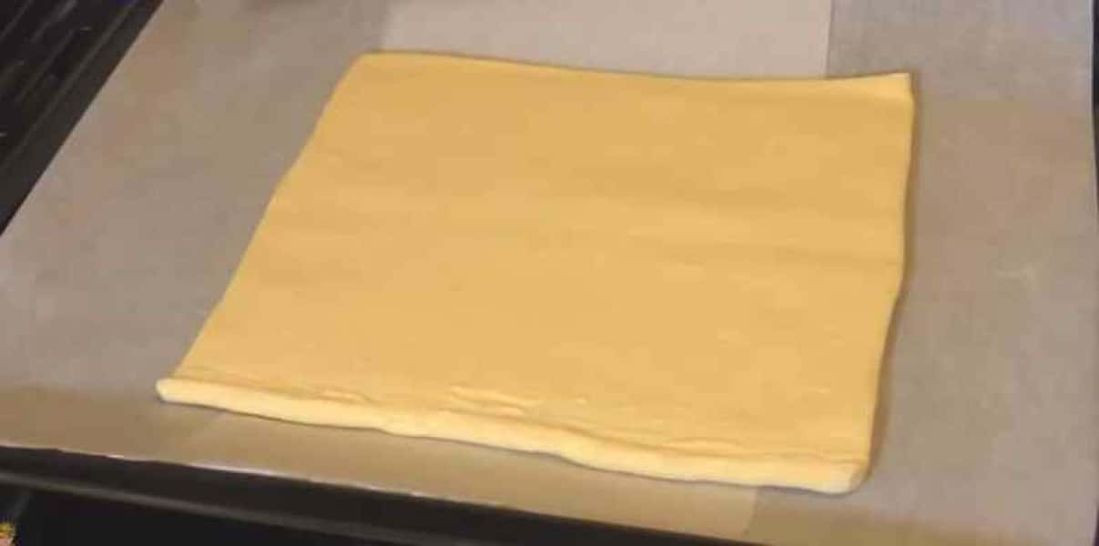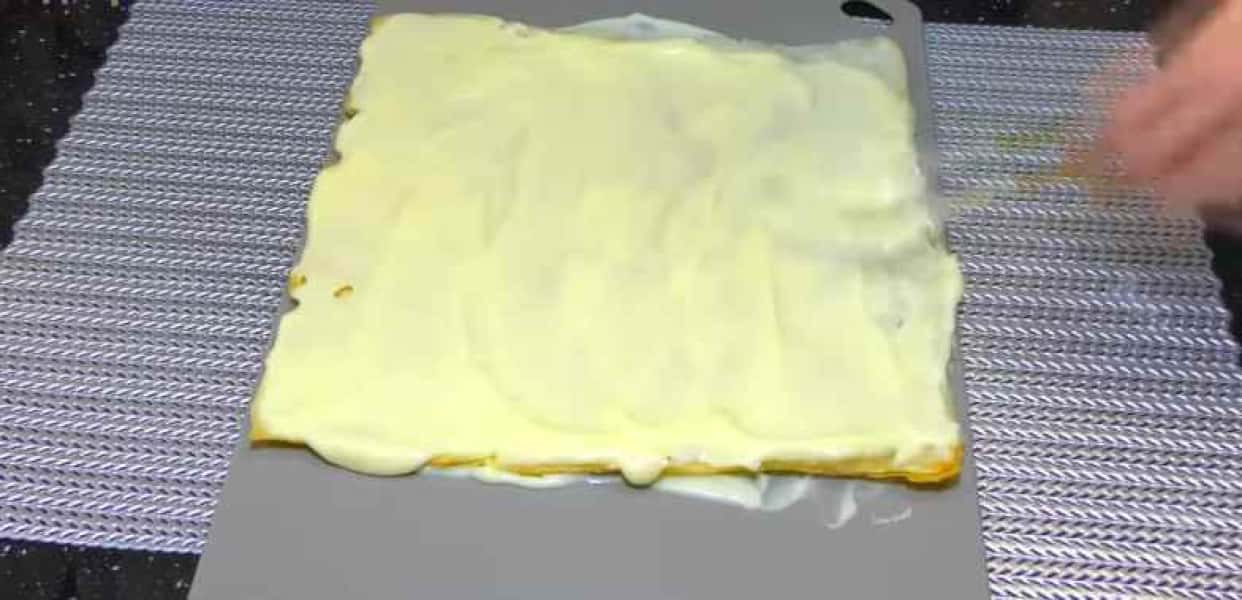 Потім крем залишаємо остигати під харчовою плівкою в контакт із кремом.Тісто розрізаємо на однакові за площею пласти. Покриваємо деко папером для випічки, викладаємо тісто на поверхню.