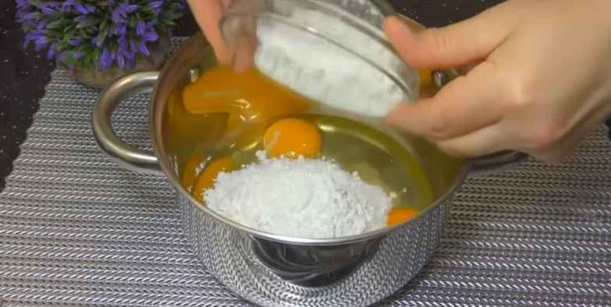 У сотейнику потрібно змішати яйця з ванільним та звичайним цукром і кукурудзяним крохмалем. Все взбиваємо.
