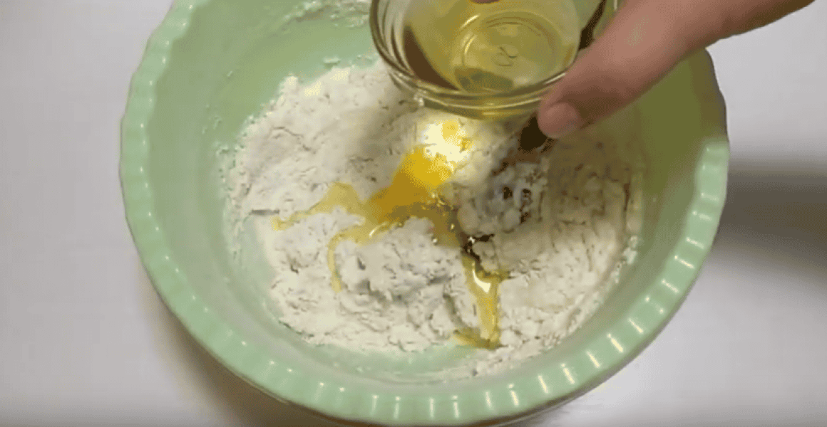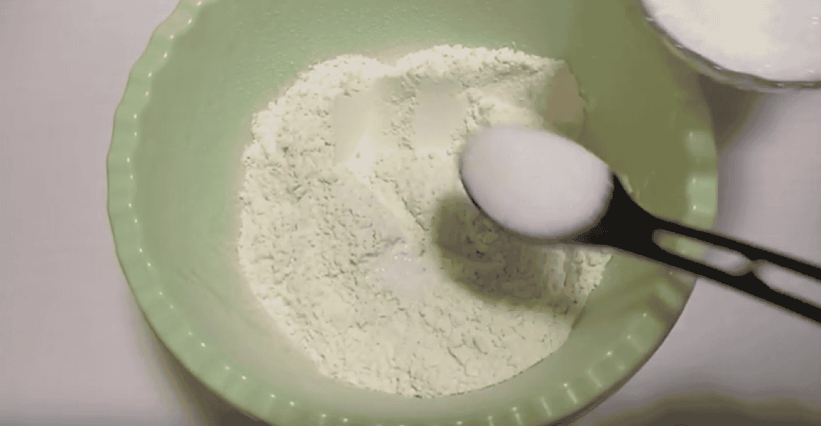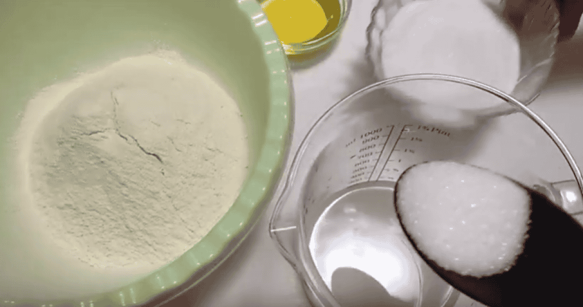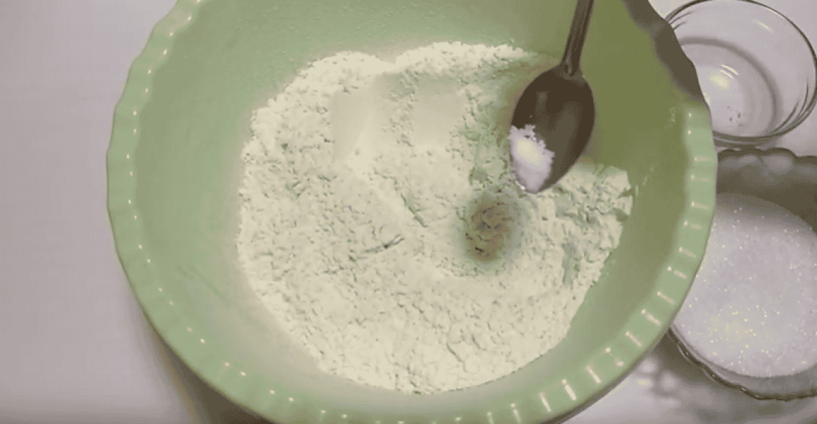 У борошно всипаємо 1/3 ч л солі, 2 ст л цукру, розмішуємо сухі інгредієнти.